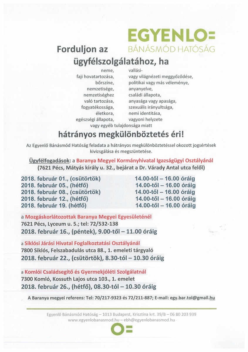 Az Egyenlő Bánásmód Hatóság közleménye alapján tájékoztatjuk Önt, hogy forduljon az Egyenlő Bánásmód Hatóság ügyfélszolgálatához, ha: