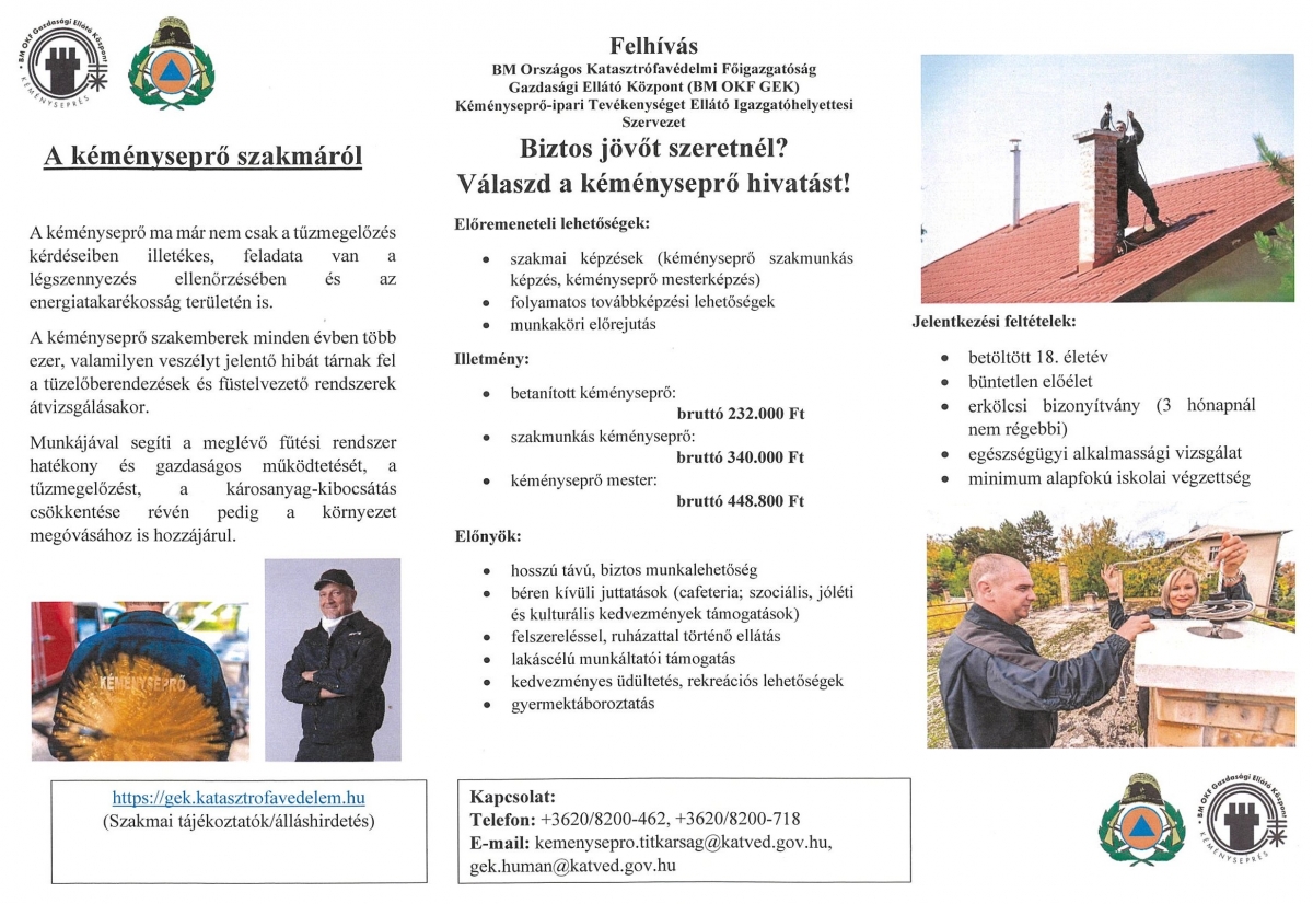 Amennyiben nem rendelkezik ilyen végzettséggel, ingyenes átképzési lehetőséget biztosítunk, a képzés ideje alatt a betanított kéményseprő számára járó illetményt garantáljuk.