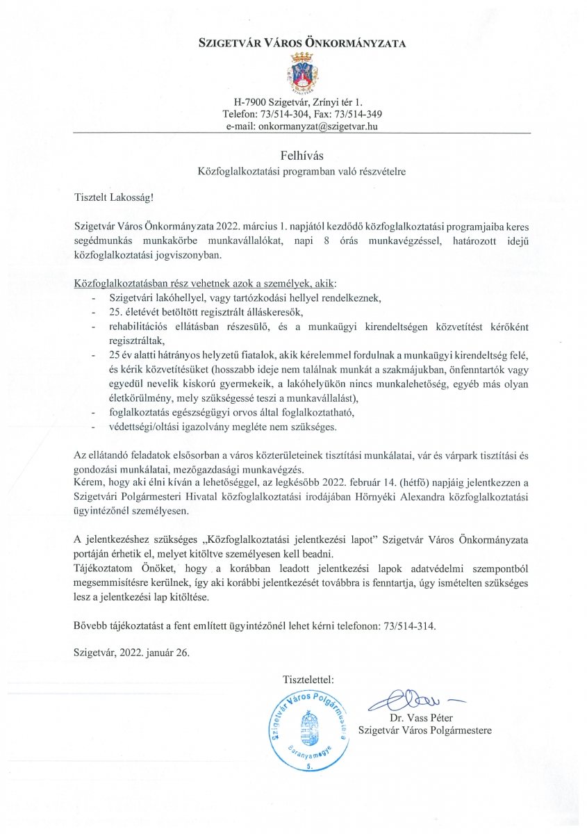Felhívás - Közfoglalkoztatási programban való részvételre