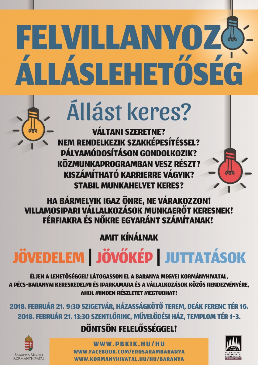 A Pécs-Baranyai Kereskedelmi és Iparkamara a Baranya Megyei Kormányhivatallal és erősáramú önkéntes kamarai tagvállalkozásokkal együttműködve, 7 helyszínen szervez lakossági fórumokat, annak érdekében, hogy a résztvevő vállalkozások és hivatalok munkatársai a vállalkozások által kínált álláslehetőségekről és a támogatott szakképzési lehetőségekről tájékoztatást nyújtsanak.