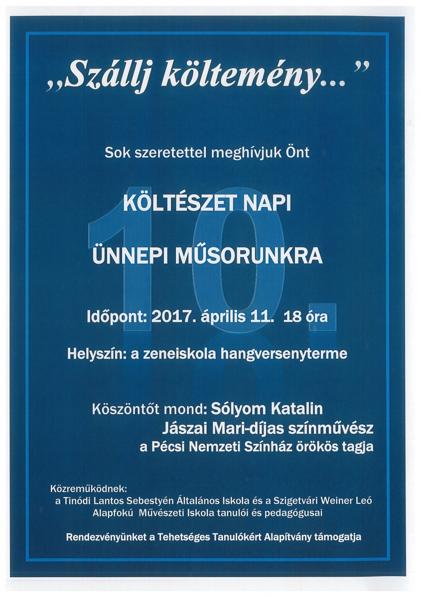 Nagy szeretettel várunk minden kedves érdeklődőt KÖLTÉSZET NAPI ünnepi műsorunkra, melyet az idei évben 10. alkalommal rendezünk meg 2017. április 11-én 18 órakor a szigetvári zeneiskola hangversenytermében. (Szigetvár, Zárda u. 2.) - Bosztonics József és Deichler András intézményvezetők