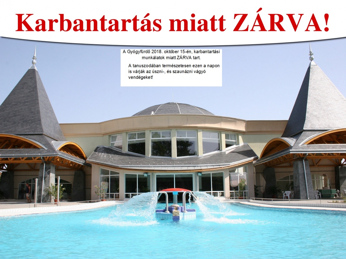 Tájékoztatjuk a Tisztelt Lakosságot, hogy a szigetvári Gyógyfürdő 2018. október 15-én, karbantartási munkálatok miatt ZÁRVA tart.