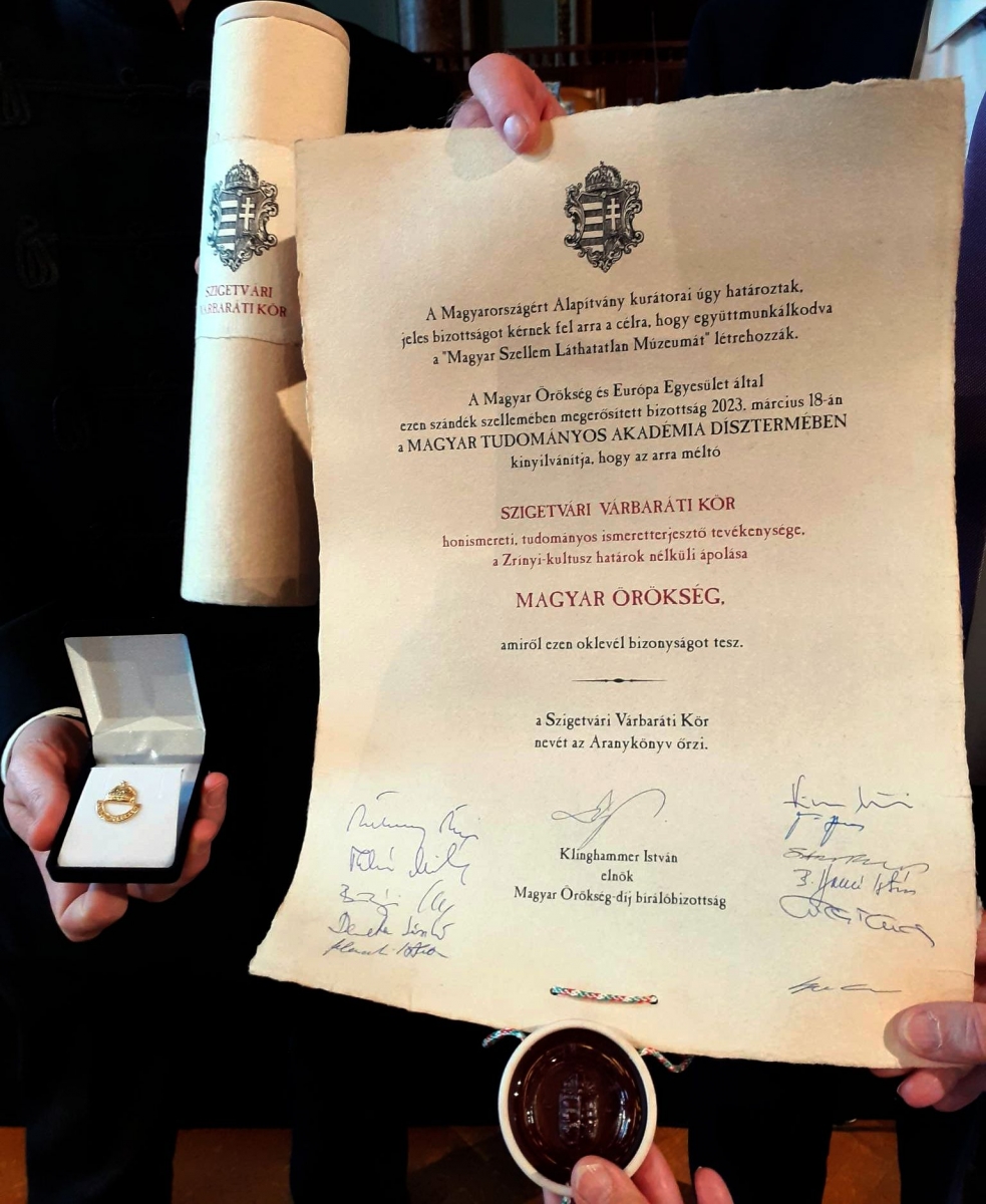 Tájékoztatjuk Önöket, hogy 2023. március 25-én a Szigetvári Várbaráti Kör a Magyar Tudományos Akadémia dísztermében más rangos díjazottakkal együtt "honismereti, tudományos, ismeretterjesztő tevékenysége, a Zrínyi-kultusz határok nélküli átadása" elismeréseképpen Magyar Örökség Díjat vehetett át.