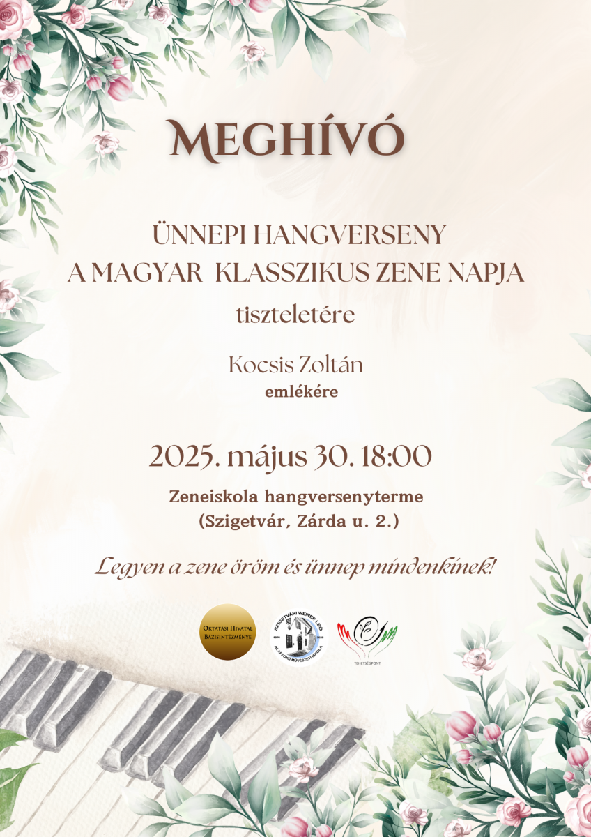 A Magyar Klasszikus Zene Napját 2021-től ünnepeljük meg hazánkban. A Nemzeti Filharmonikusok egykori karmesterük, Kocsis Zoltán zongoraművésznek a születésnapját – május 30. - választották erre az ünnepre, tisztelegve a magyar nemzeti zenekultúrában betöltött kiemelkedő tevékenysége előtt. Iskolánk már az első évben csatlakozott az országos programhoz és az idei évben is tisztelegni fogunk Kocsis Zoltánra emlékezve. 2025. május 30-án 18:00 órai kezdettel a szigetvári zeneiskola hangversenytermében kerül sor az ünnepi hangversenyre, ahol növendékeink és tanáraink előadásában hallhatnak magyar zeneszerzőktől műveket.