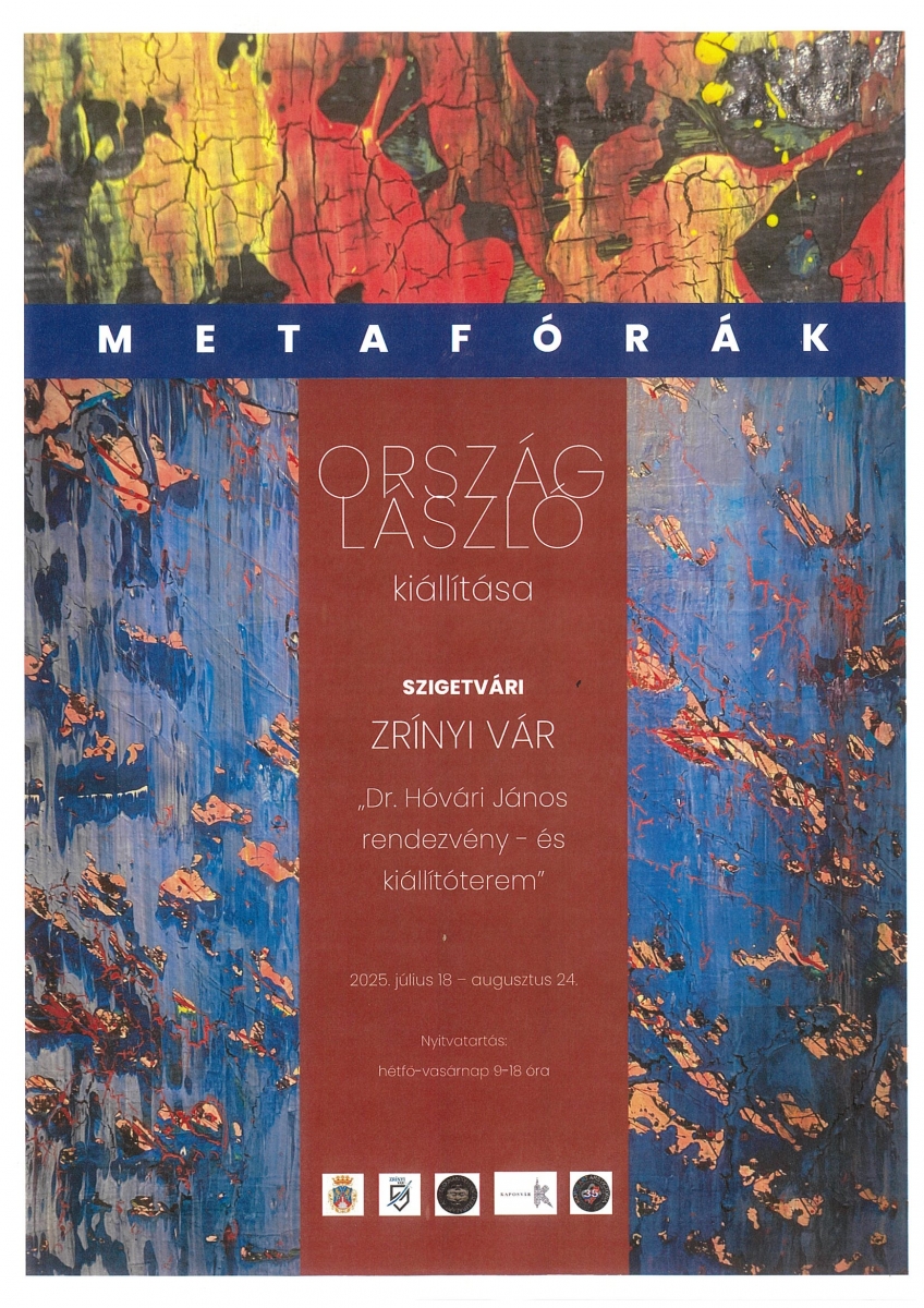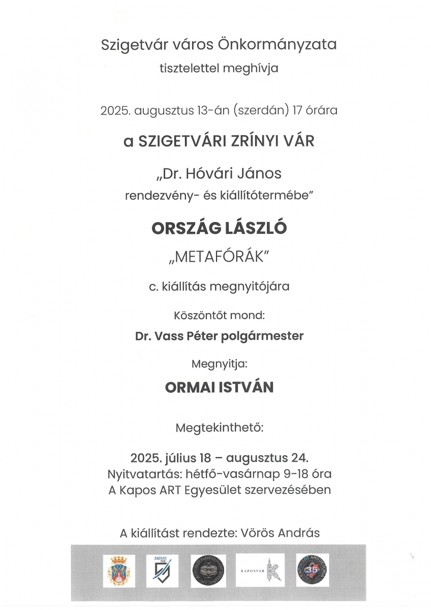 Tájékoztatjuk, hogy Ország László "Metafórák" c. kiállítása 2025. július 18-tól - augusztus 24-ig tekinthető meg a Szigetvári Zrínyi Vár Dr. Hóvári János rendezvény- és kiállítótermében. A kiállítás megnyitója: 2025. augusztus 13-án 17 órakor lesz. Az eseményre szeretettel várjuk!