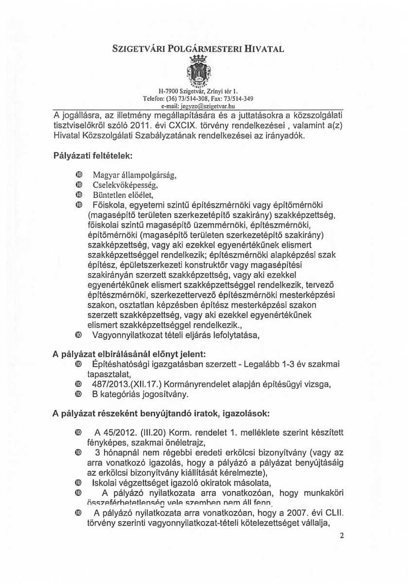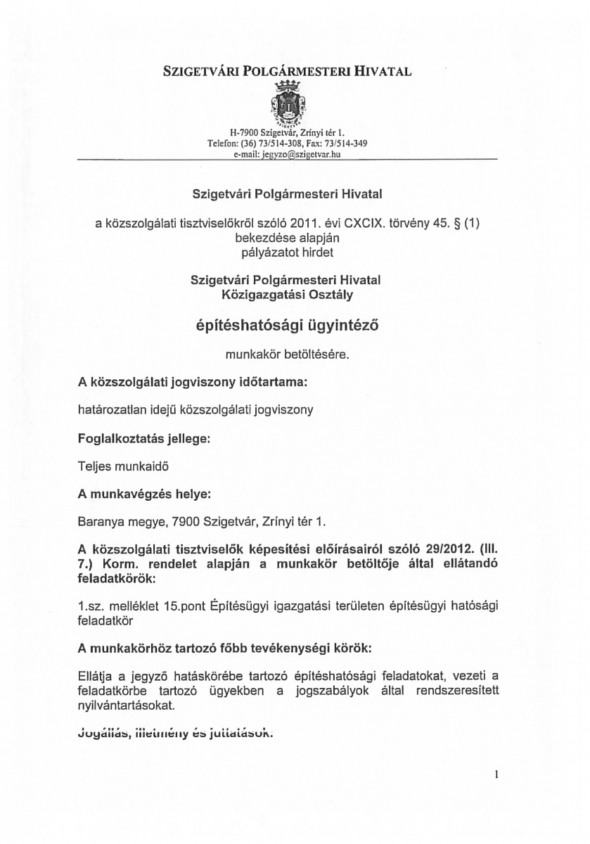 Szigetvári Polgármesteri Hivatal pályázatot hirdet a Közszolgálati tisztviselőkről szóló 2011. évi CXCIX. törvény 45. § (1) bekezdése alapján