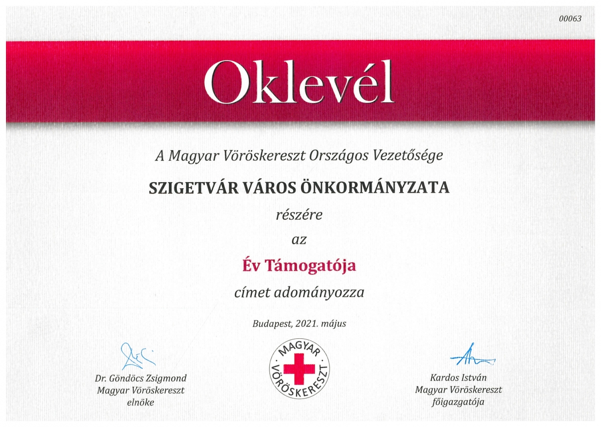 Örömmel tájékoztatom Önöket, hogy a Magyar Vöröskereszt Országos Vezetősége Szigetvár városának az „Év Támogatója” címet adományozta.