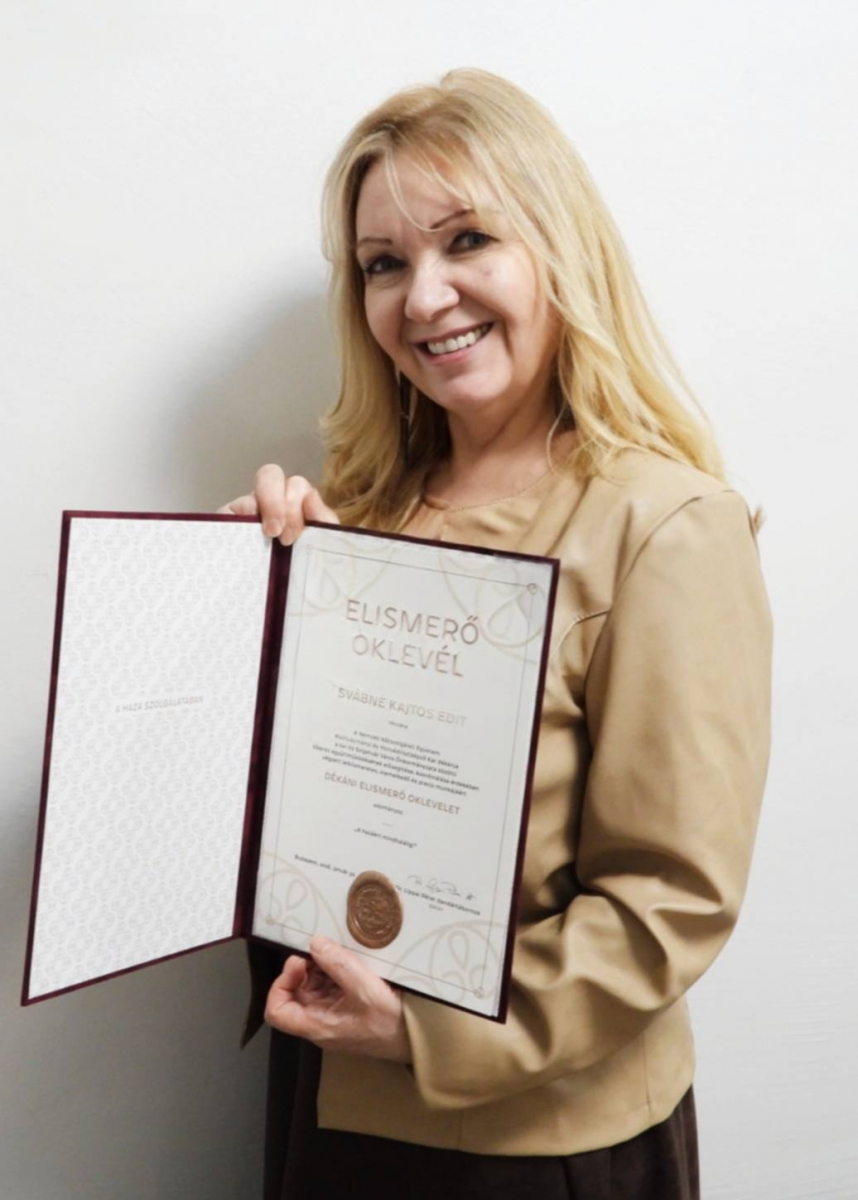 Örömmel tájékoztatom Önöket, hogy a Nemzeti Közszolgálati Egyetem Hadtudományi és Honvédtisztképző Kar dékánja, - Dr. Lippai Péter dandártábornok - döntése alapján munkatársunk: Svábné Kajtos Edit titkárságvezető „DÉKÁNI ELISMERŐ OKLEVÉL” kitüntetésben részesült, melyet 2026. január 30-án vett át a Nemzeti Közszolgálati Egyetemen tartott „Kar Napja” ünnepség alkalmából.