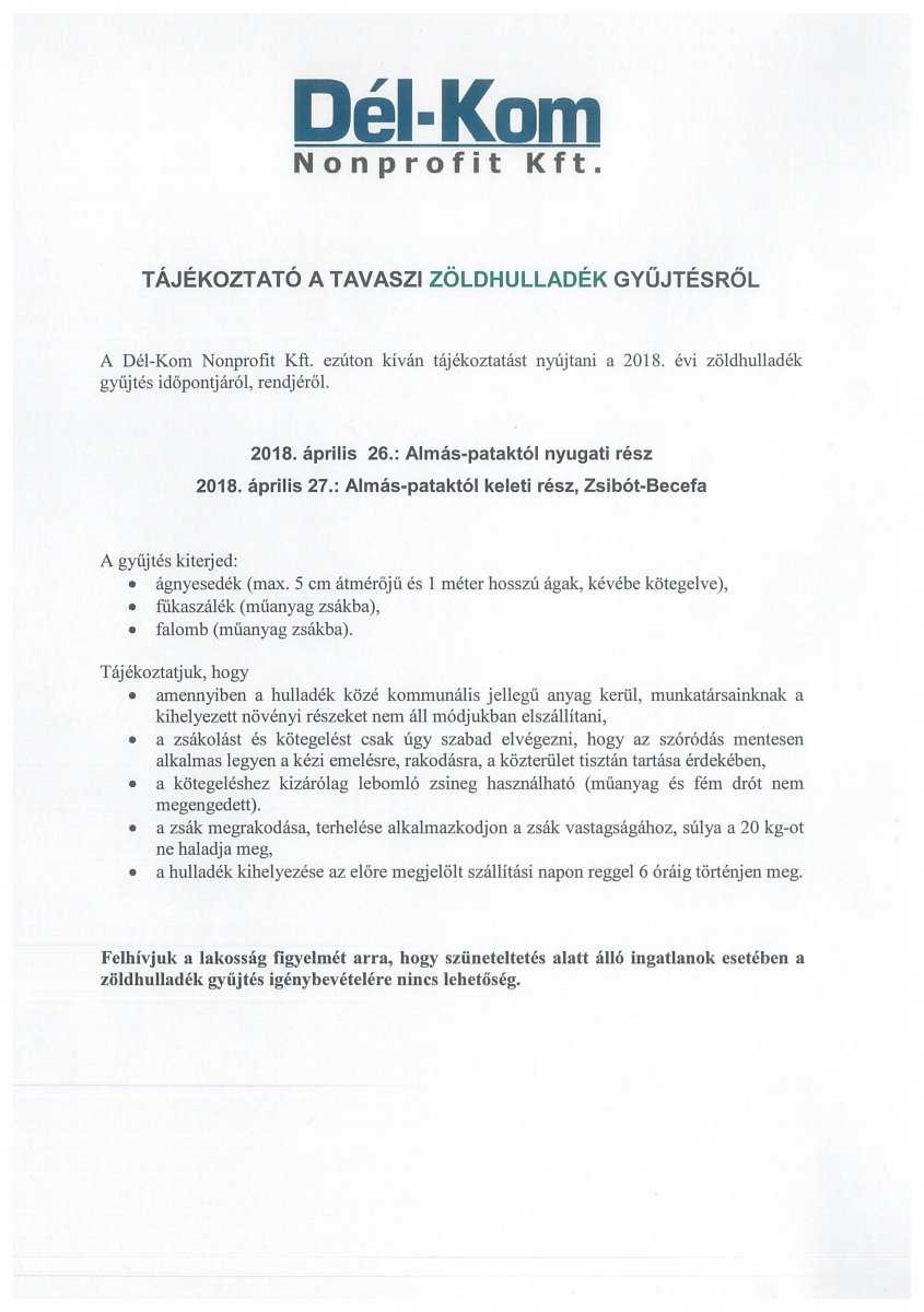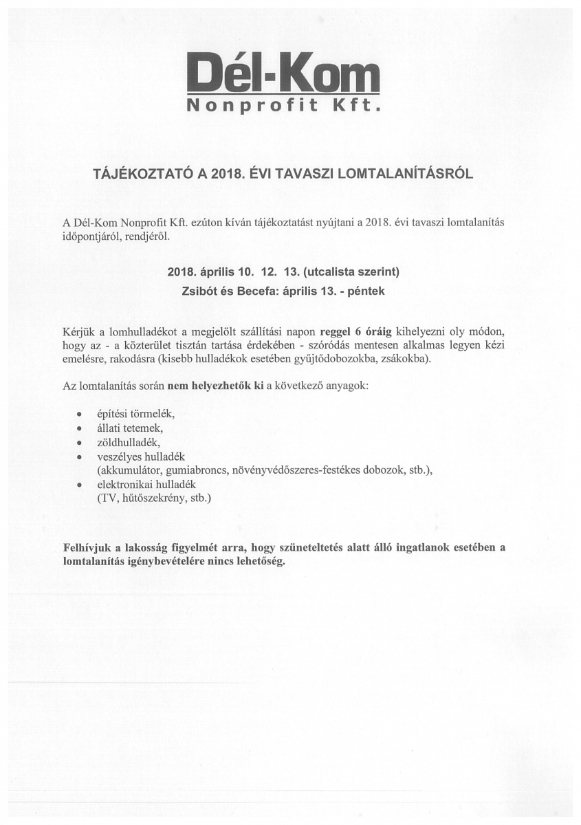 Tájékoztató a 2018. évi tavaszi lomtalanításról - zöldhulladék gyűjtésről