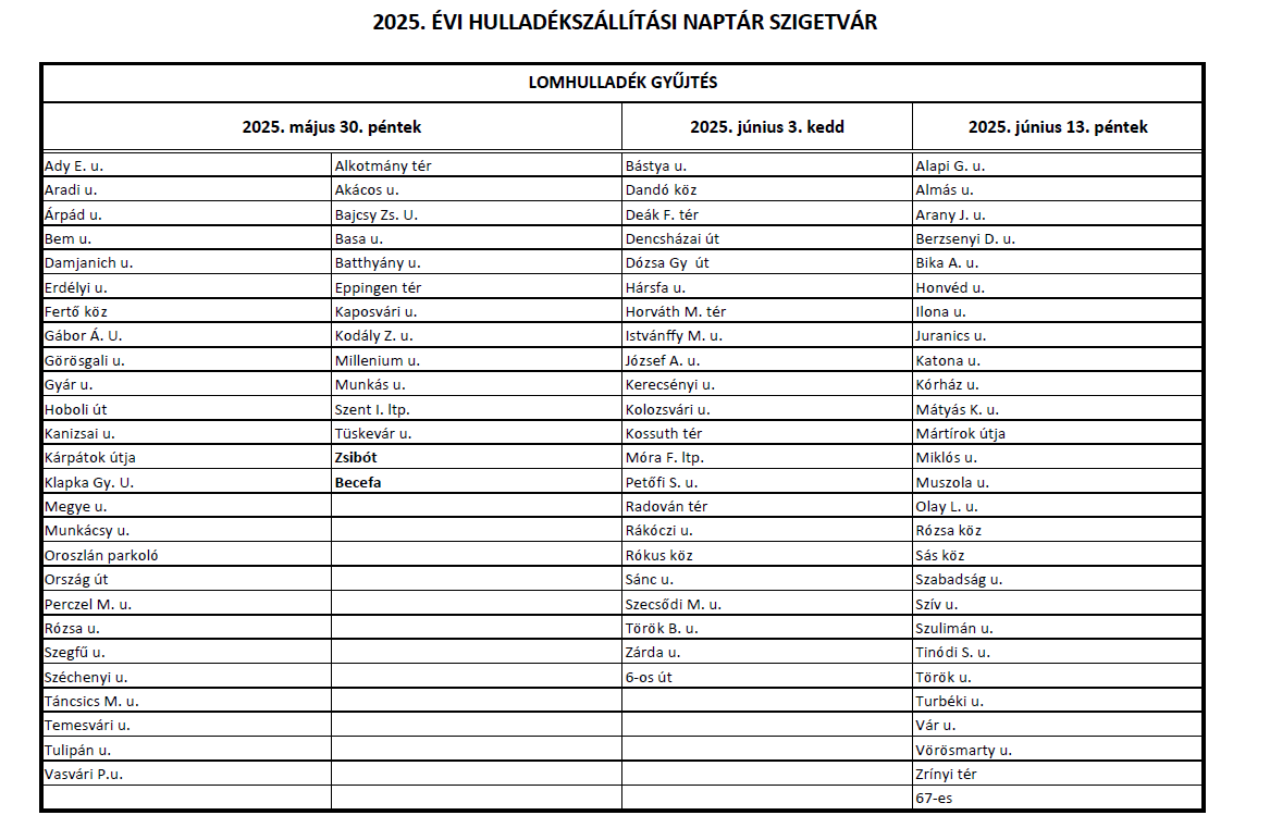 Szigetvár Város Önkormányzat hivatalos képviselőjeként tájékoztatom Önöket Szigetvár területén a lentebb csatolt táblázat alapján 2025. május 30-án, 2025. június 03-án és 2025. június 13-án Dél-Kom Nonprofit Kft. által tervezett lomtalanításokról.