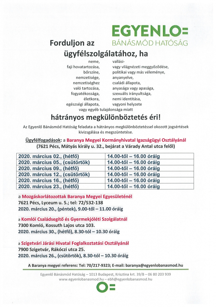 Tájékoztató az Egyenlő Bánásmód Hatóság 2020. márciusi ügyfélfogadásáról