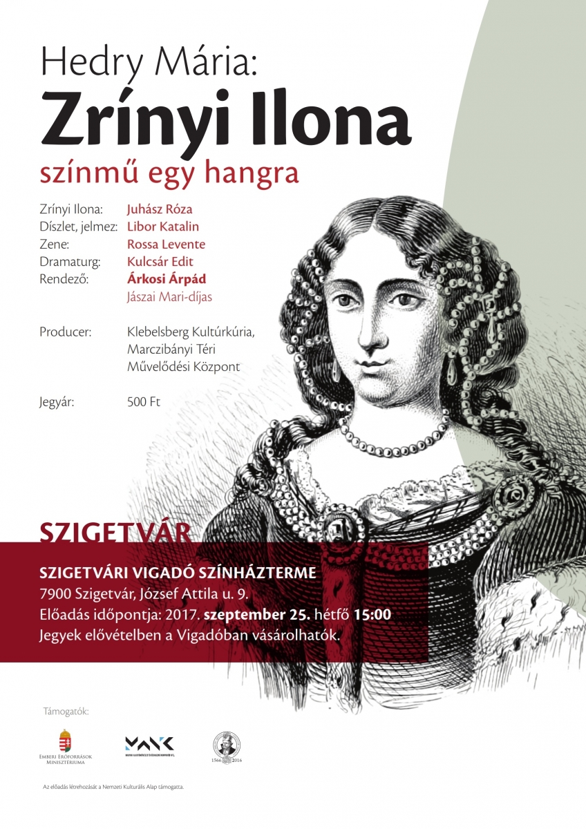 A szigetvári Vigadó Színháztermében: 2017. szeptember 25-én (hétfőn) 15 órai kezdettel kerül bemutatásra a Zrínyi Ilona c. monodráma.